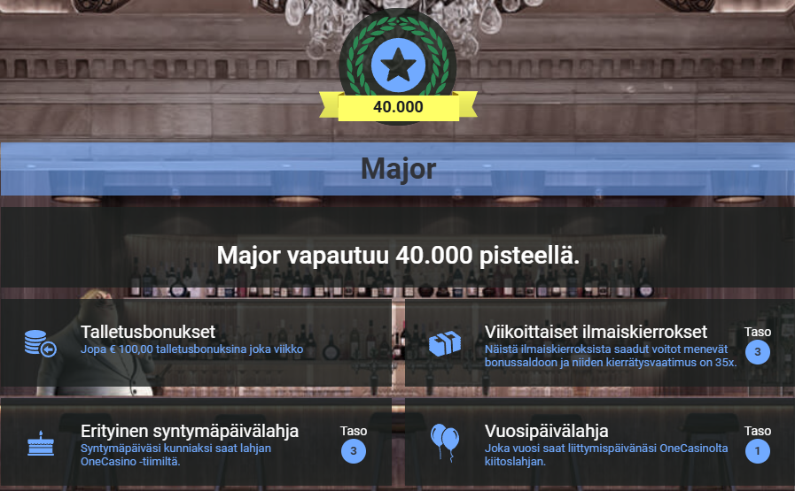 Taso kerrallaan etuudet paranevat. Parasta One Club -etuohjelmassa on se, että tasot eivät nouse tappioista riippuen vaan nimenomaan kierrätyksestä johtuen. Eli voit nousta reilusti tasoissa vaikka olisit edelleen voitolla peleistä. Se tosin vaatii hieman lady Fortunaa. Jo Member -tasolla alat samaan viikoittaisia talletusbonuksia ja nämä bonukset paranevat aina tasoja ylöspäin noustessa.